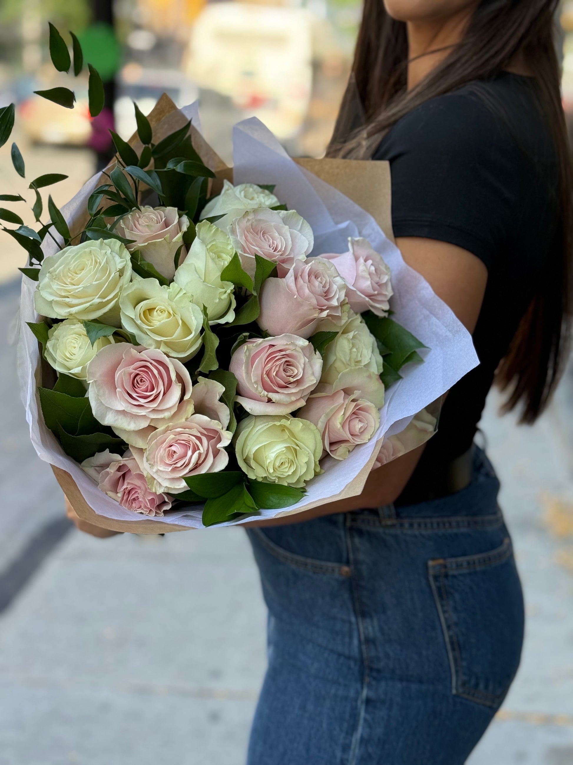 A sophisticated blend of tender pink and soft cream roses, nestled in lush greenery. This elegant bouquet offers a timeless, gentle beauty perfect for celebrating any sweet moment.