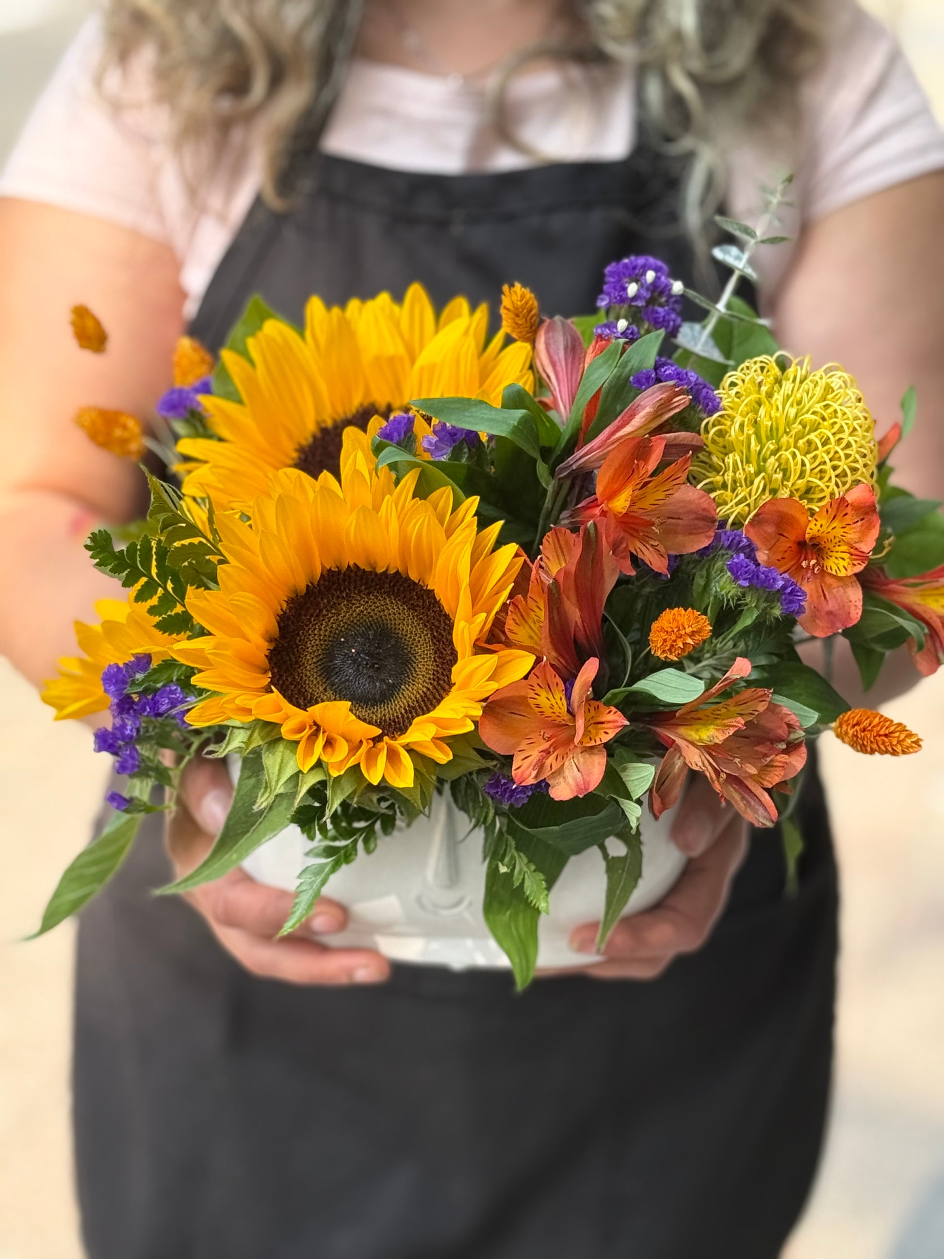 A vibrant bouquet that captures the warm, radiant beauty of a fall sunset. This arrangement is filled with bright sunflowers, fiery alstroemeria, and pops of purple and gold, bringing all the cozy, golden hues of autumn into your home.