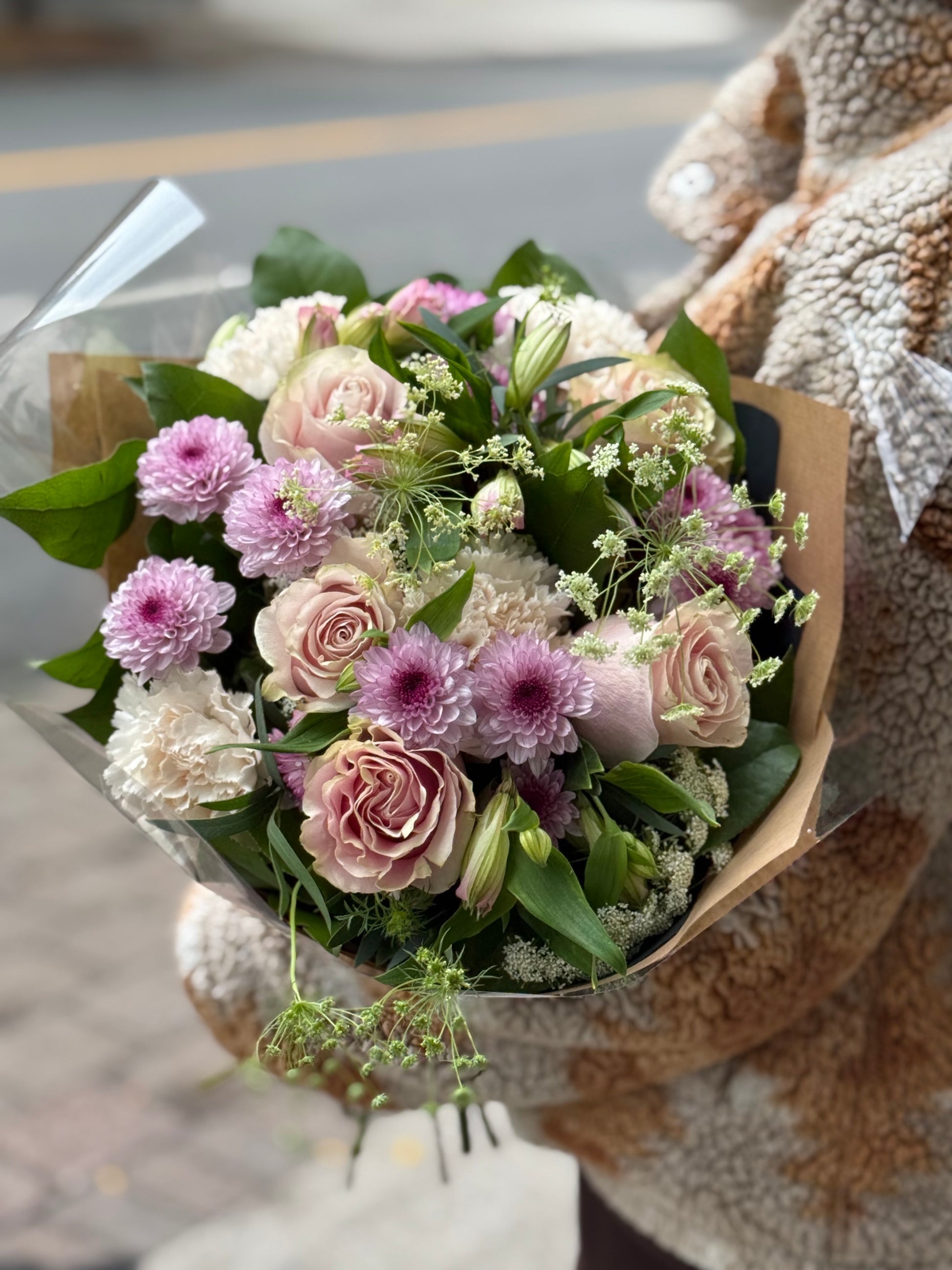 This arrangement is a soft symphony of dusty-rose roses and vibrant mauve mums, accented by delicate cream and green fillers. It captures a feeling of gentle romance and subtle, natural elegance.