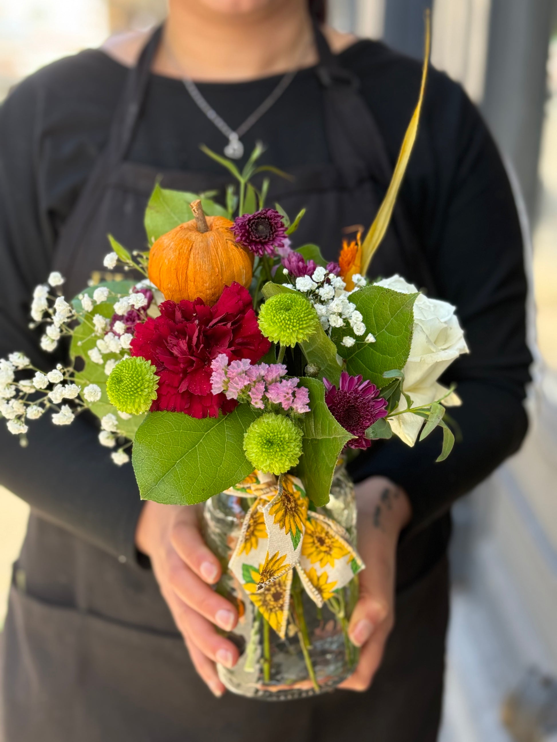 Cute and sweet jar arrangements that bring a ray of sunshine to any space! This flower arrangement is made up with a variety of colourful seasonal flowers.