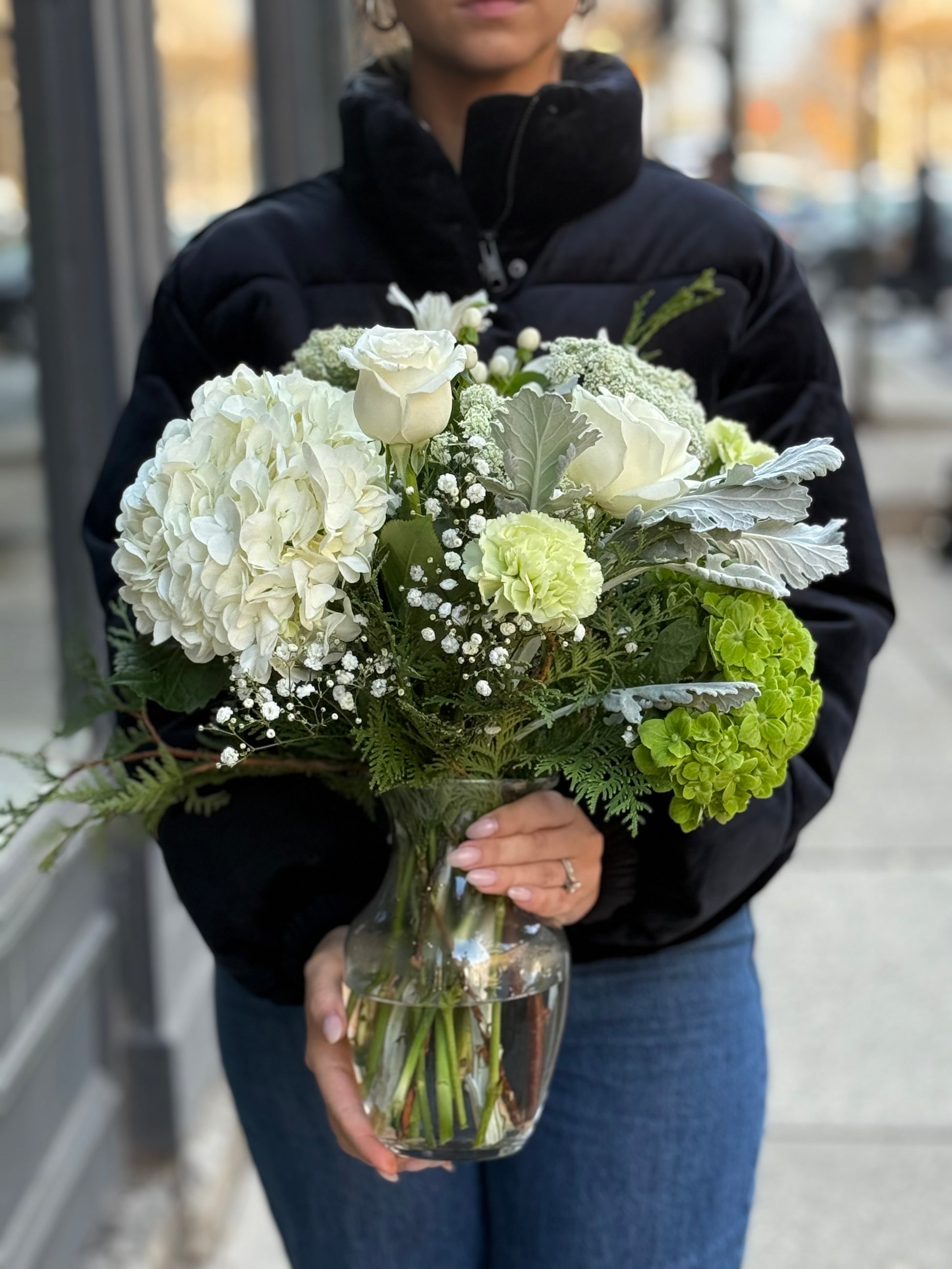 A beautifully serene arrangement featuring lush white hydrangeas and classic roses, accented by vibrant green cymbidiums and soft, silvery dusty miller foliage. This crisp, textural bouquet evokes pure elegance and quiet sophistication.