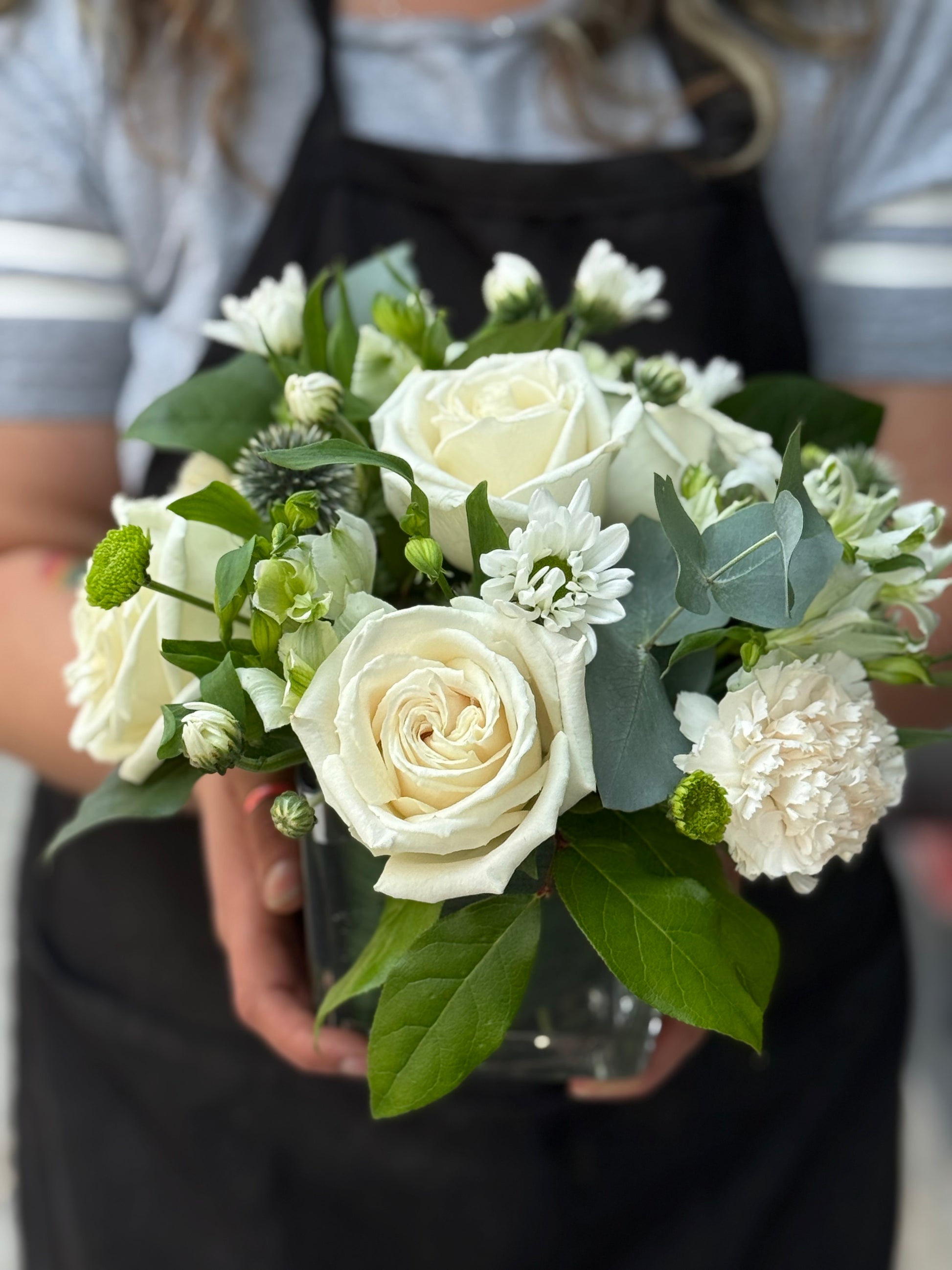 This arrangement is a beautiful mix of white and cream flowers, including roses, carnations, and button chrysanthemums, accented with green foliage. The flowers are tightly arranged in a clear square vase, creating a clean, modern, and sophisticated look.