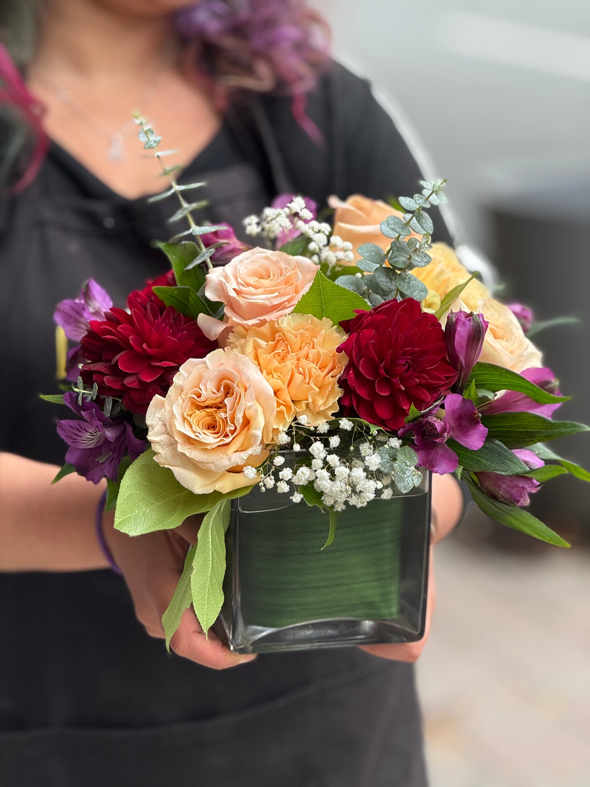 A warm and captivating mixed bouquet, this arrangement perfectly blends rich burgundy dahlias and sunset-hued roseswith pops of sunny yellow and deep violet for a feeling of cozy, effortless elegance.