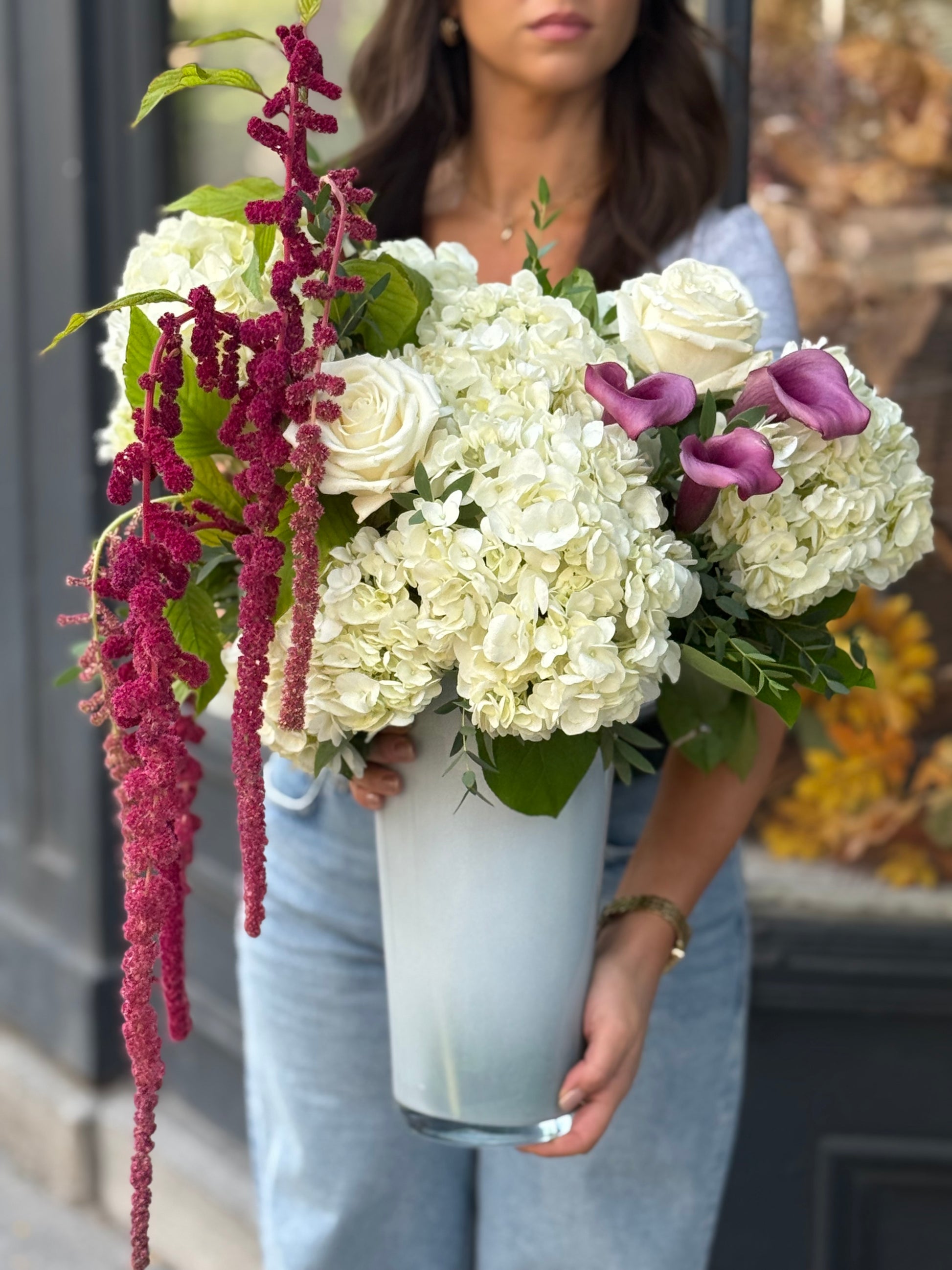 A beautiful blend of white hydrangeas, white roses, and purple calla lilies, with a dramatic cascade of deep red amaranthus arranged beautifully in a large modern white vase
