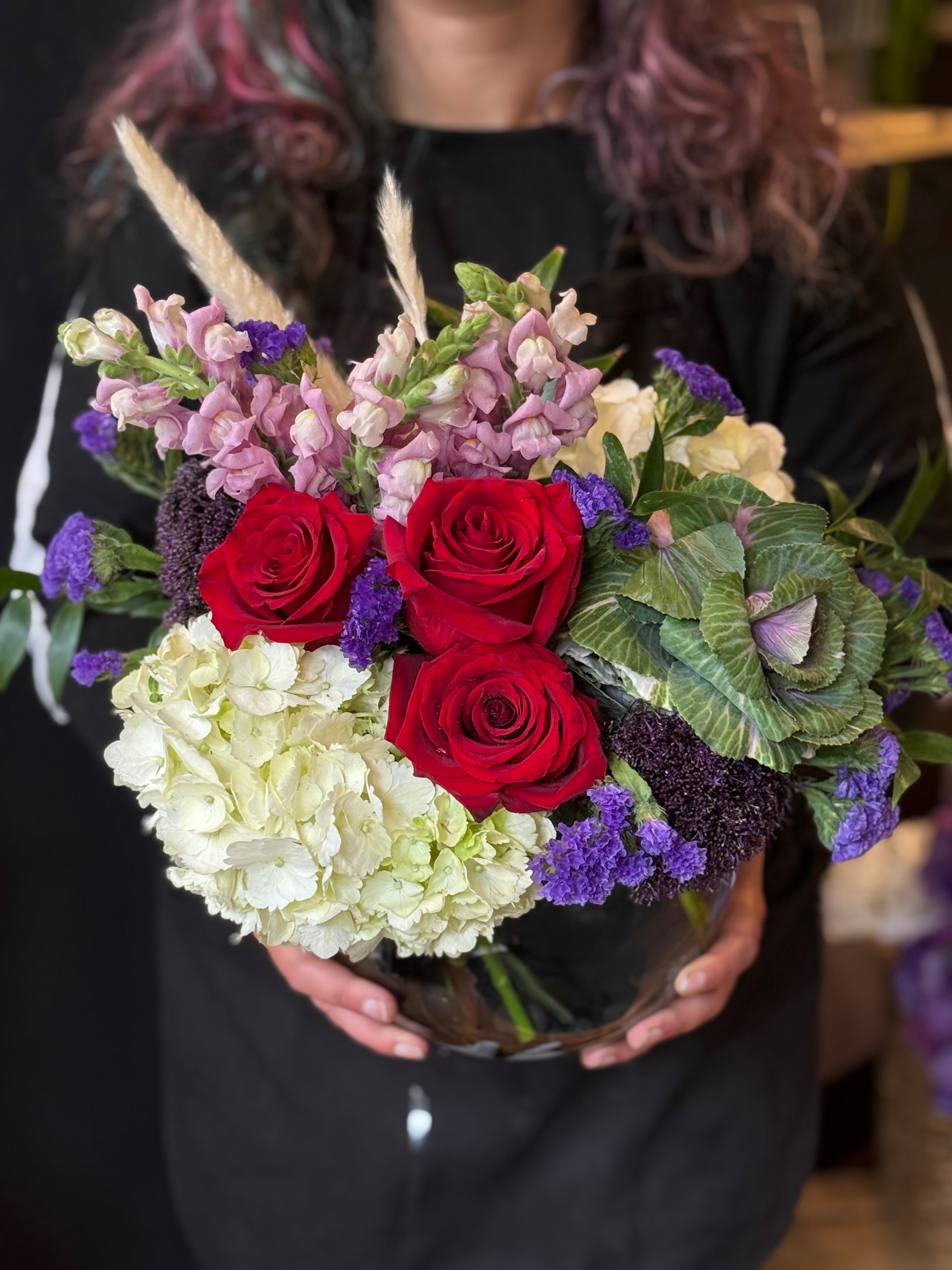A striking holiday-inspired arrangement that contrasts velvety red roses and creamy white hydrangea with cool tones of purple statice and layered decorative cabbage.