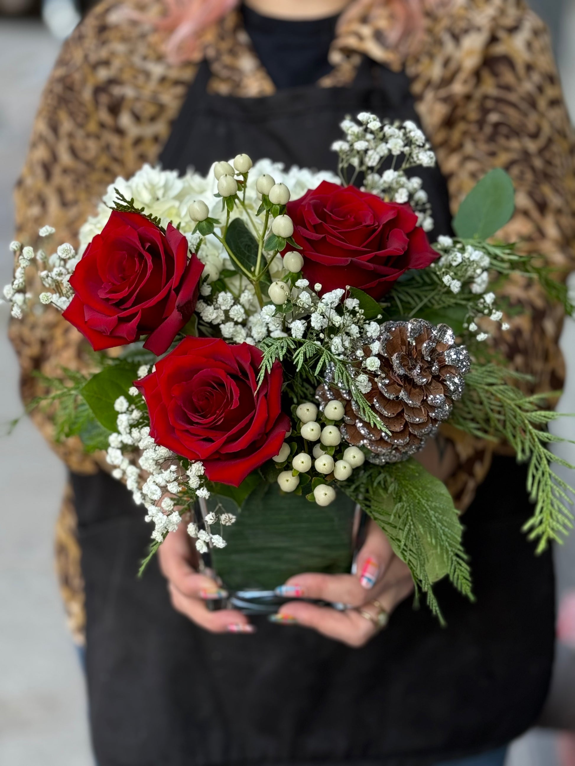This simple and elegant holiday arrangement is chic and classic with notes of red and white and evergreen along with the pinecone really ties this centrepiece together to create holiday magic.