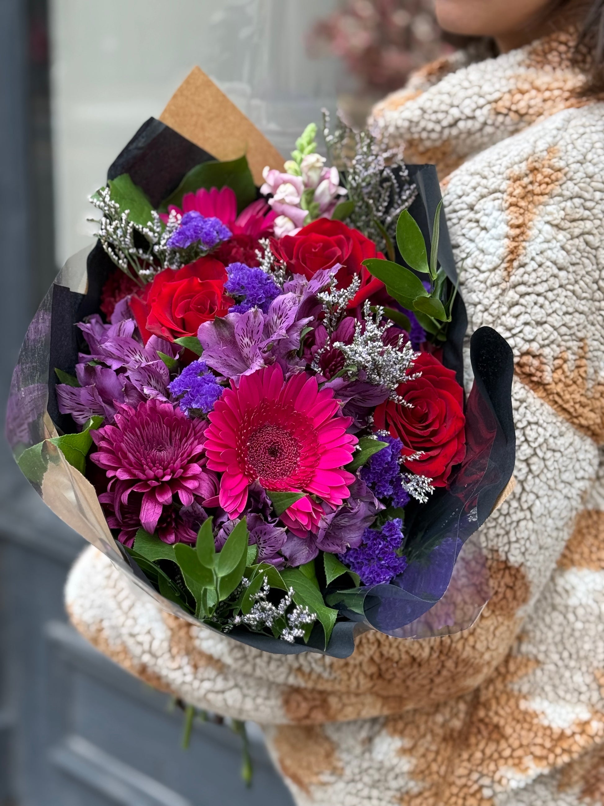 This stunning arrangement is a passionate jewel-tone mix of classic red roses, deep magenta gerbera daisies, and lush purple accents. It’s a bold and luxurious statement, perfect for expressing deep love or excitement.